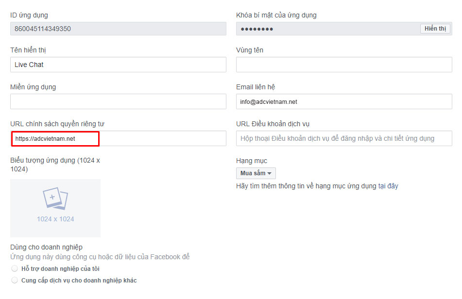 3. Thông tin duy nhất mà các bạn bắt buộc phải điền trong phần này là URL chính sách quyền riêng tư (nên điền URL website của bạn). Những mục khác các bạn có thể bỏ qua.