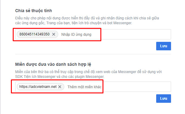 Thêm tên miền của bạn vào White list Miền hợp lệ (Nếu muốn hiển thị Facebook Customer Chat trên nhiều website cùng lúc, các bạn có thể điền nhiều URL trong mục này).