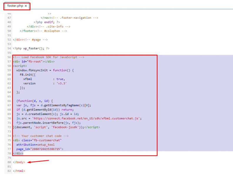 8. Chèn đoạn mã vào Footer của blog/ website. Đối với mã nguồn WordPress, các bạn có thể chèn đoạn mã này vào bên trên thẻ </body> của file footer.php nằm trong thư mục theme.