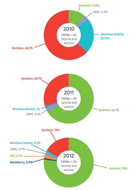 Tính riêng trong năm 2012, Android chiếm đến 79% trong tổng số 301 loại mã độc khác nhau xuất hiện trên các nền tảng di động, trong khi đó iOS của Apple chỉ chiếm “khiêm tốn” 0,7%.