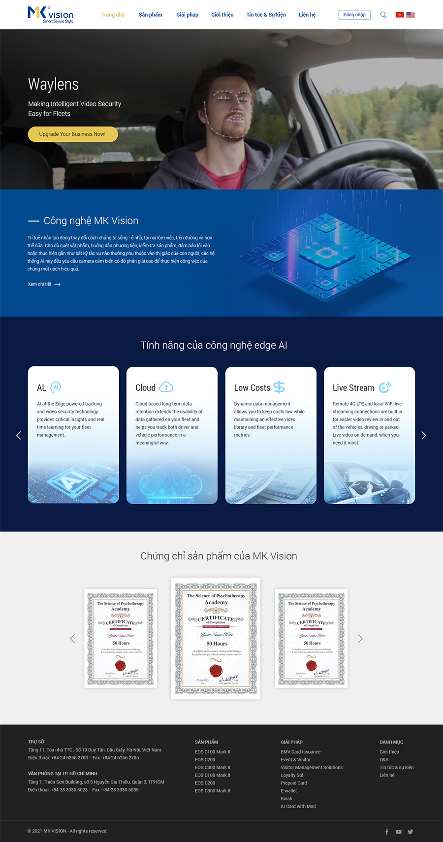 Công ty cổ phần MK Vision được thành lập vào tháng 7 năm 2020 và là thành viên của MK Group. Chúng tôi tập trung phát triển phần cứng và ứng dụng công nghệ camera thông minh tích hợp trí tuệ nhân tạo (AI camera). MK Vision cam kết đưa ra thị trường những dòng sản phẩm camera hiện đại và cao cấp với chất lượng quốc tế, phục vụ nhu cầu giám sát và quản lý đặc thù tại Việt Nam.