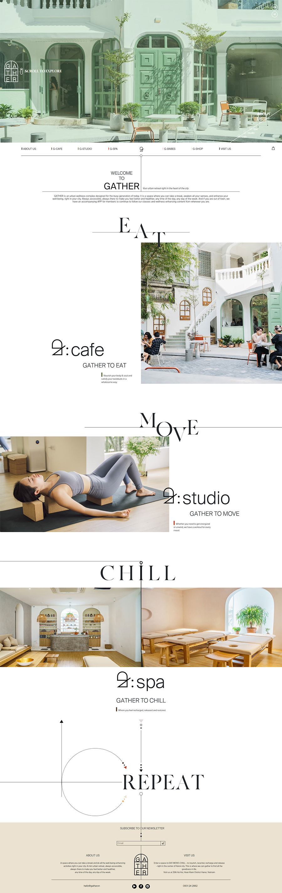 Khai trương vào mùa Thu năm 2020, khu phức hợp chăm sóc sức khỏe GATHER trở nên sống động trong một biệt thự Pháp lịch sử, có diện tích hơn 600 mét vuông và bao gồm một nhà hàng-quán cà phê bình dân và lành mạnh với thực đơn đồ ăn ngon và lành mạnh, một quầy bar “những bức ảnh tốt cho sức khỏe” độc đáo , phòng tập yoga & tập thể dục với hơn 10 ý tưởng tập thể dục khác nhau và spa chăm sóc sức khỏe đầy đủ với bồn tắm riêng thư giãn trên tầng thượng. Tại GATHER, chúng tôi biến việc chăm sóc bản thân trở thành niềm đam mê.