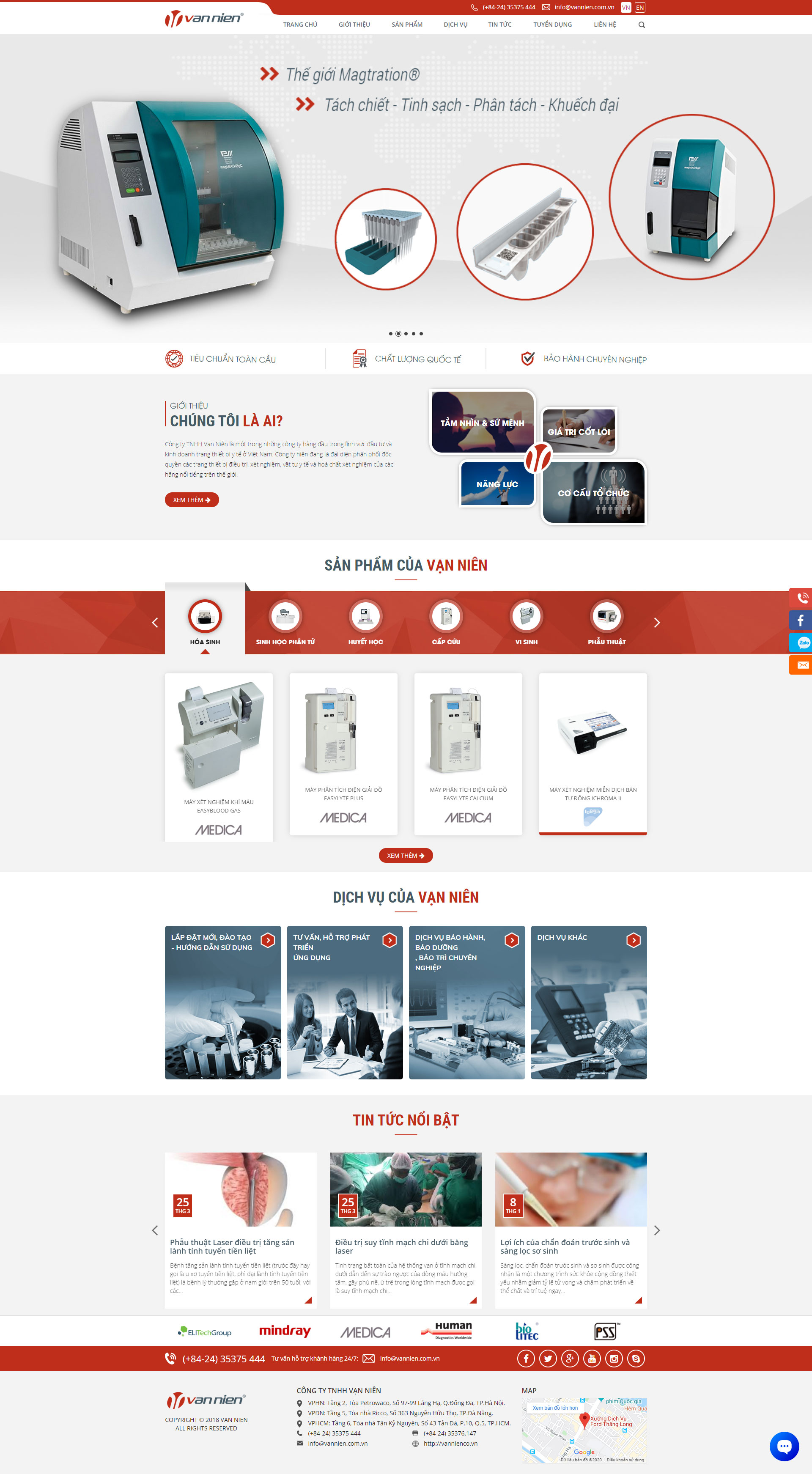 Hiện nay công ty chúng tôi đang phân phối độc quyền và phân phối chính thức cho nhiều nhãn hàng nổi tiếng trên thế giới như: HUMAN (Đức), ELITECH (Pháp), BIOLITEC (Đức), MEDICA (Mỹ), BODITECH (Hàn Quốc), ORPHEE (Đức), MINDRAY (Trung Quốc),...Các nhãn hàng này không những đã khẳng định được thương hiệu trên toàn thế giới mà còn có mặt tại hầu khắp các bệnh viện và trung tâm y tế trên cả nước. Chúng tôi hiểu rằng kinh doanh thiết bị y tế là ngành kinh doanh đặc biệt, ảnh hưởng trực tiếp đến sức khỏe cũng như tính mạng của con người. Do vậy ngay từ khi băt đầu hoạt động, chúng tôi đã xác định phương châm kinh doanh là cung cấp các sản phẩm chất lượng, đạt tiêu chuẩn quốc tế và luôn đặt chất lượng dịch vụ hỗ trợ kỹ thuật bao gồm bảo hành, bảo trì, sửa chữa, đào tạo và hướng dẫn sử dụng lên hàng đầu. Đây là một trong những chìa khóa dẫn đến thành công của chúng tôi như hiện nay và sẽ luôn là định hướng của chúng tôi trong tương lai.